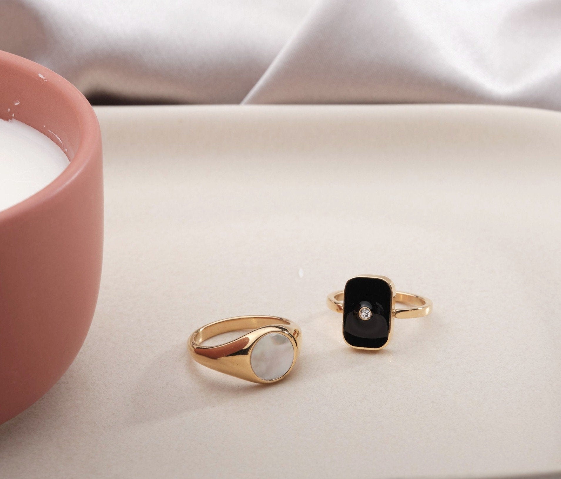 18K Gold Black Enamel Rectangle Gold Signet Rings, Zirconia North Star Ring, Wide Gold Ring, Statement Ring, Chuncky Ring Gold Black Ring