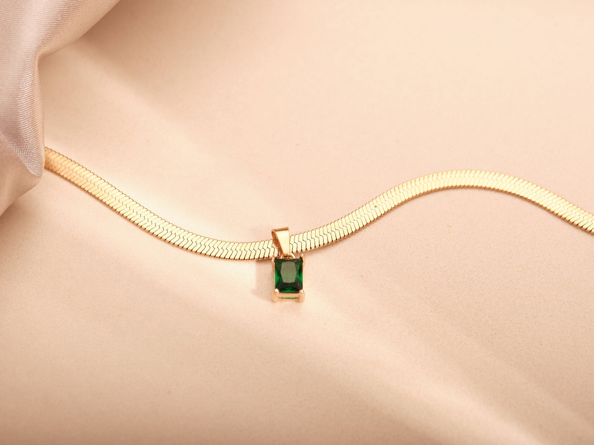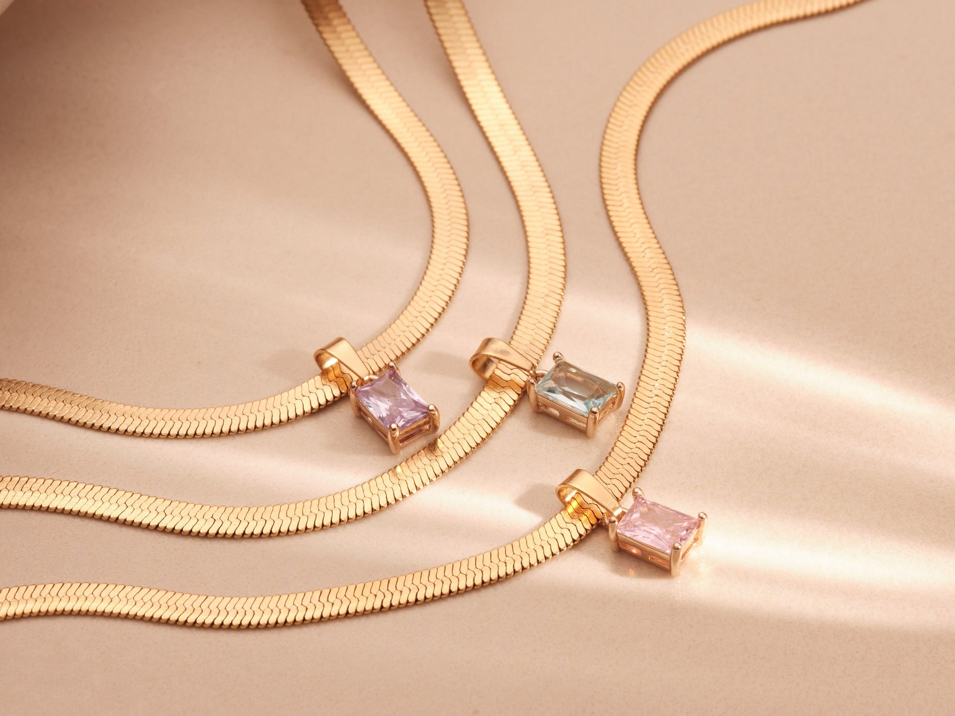 18K Gold Herringbone Chain Necklace Gemstone Necklace, CZ Choker Necklace, Crystal Zircon Pendant, Snake Chain Necklace Waterproof Jewelry
