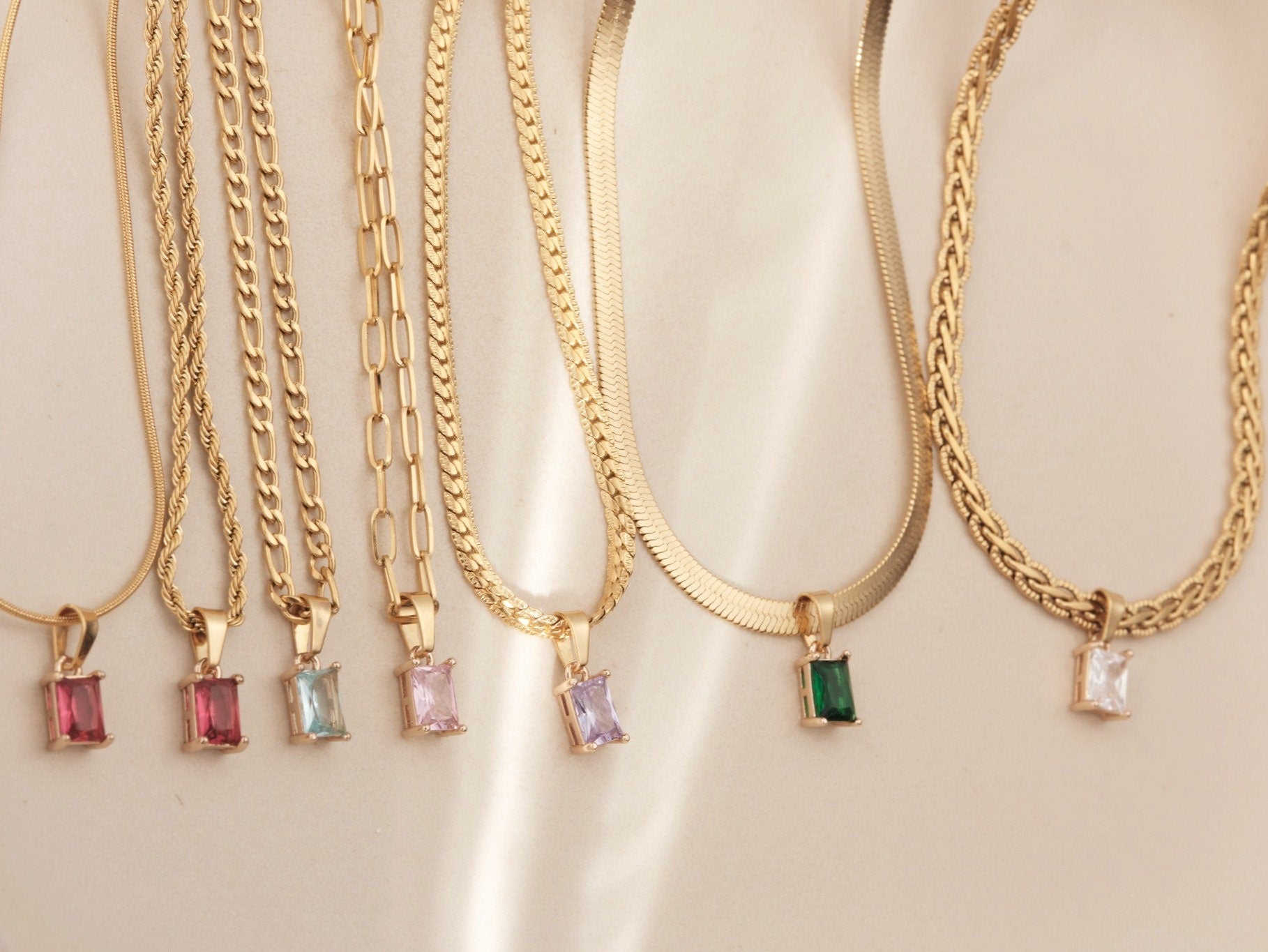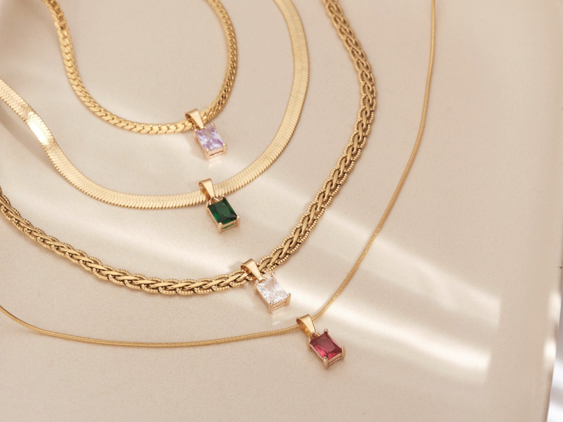 18K Gold PVD Herringbone Choker Necklace Gemstone Necklace, CZ Choker Necklace, Zircon Pendant, Snake Chain Choker Waterproof Necklace