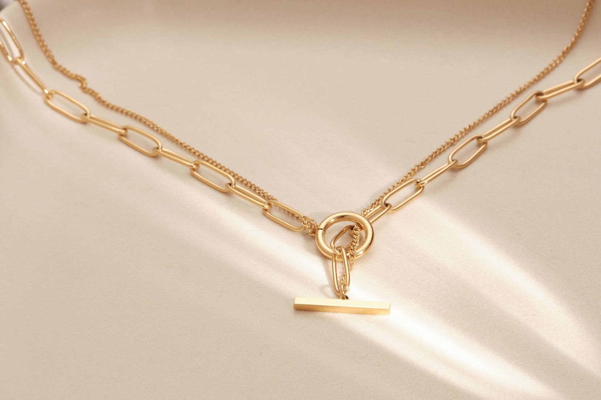 18K Gold Rectangle Chain Toggle Cuban Necklace, Double Chain, OT Necklace, Toggle Clasp Choker, Double Layer Necklace WATERPROOF jewelry