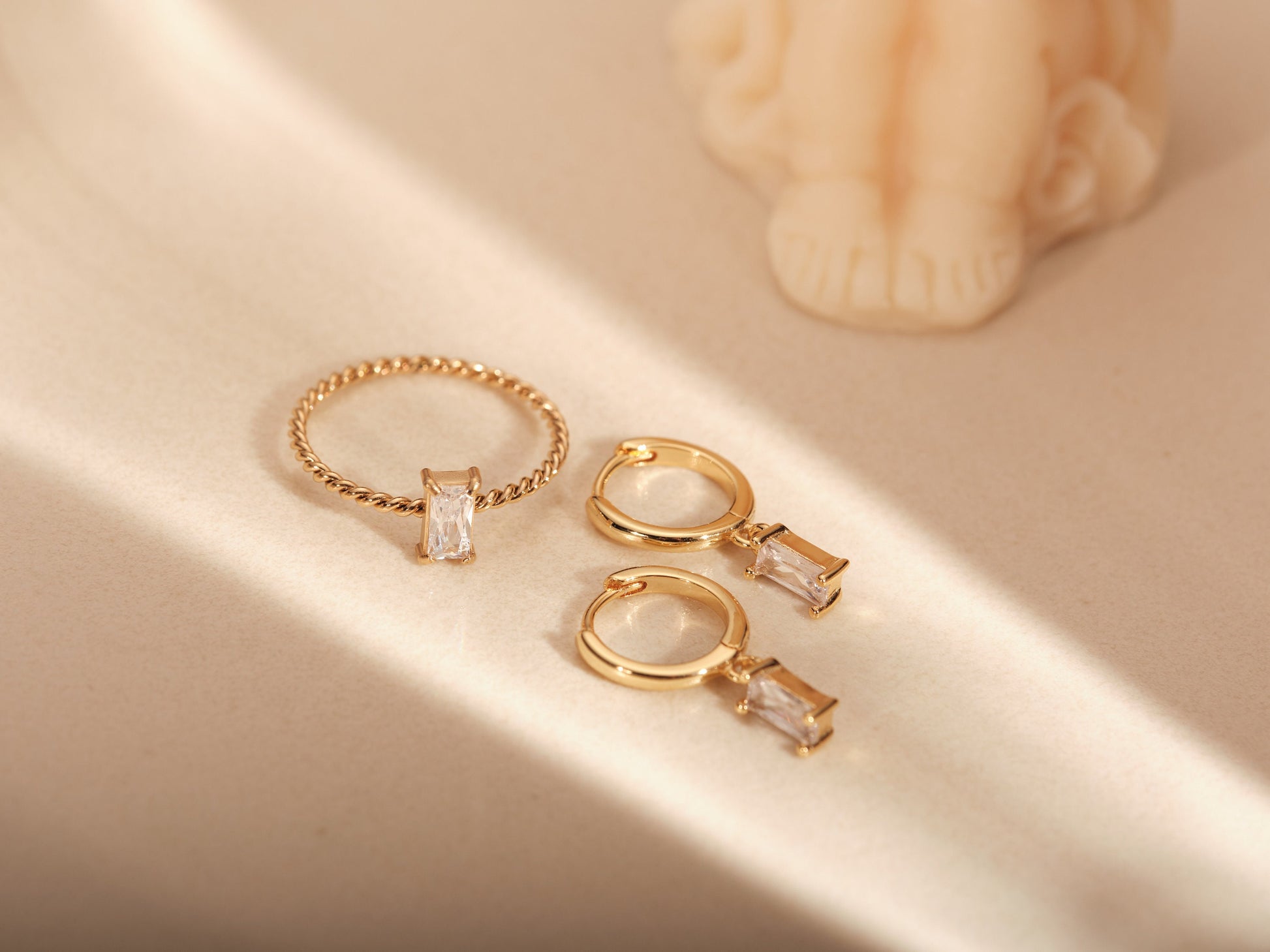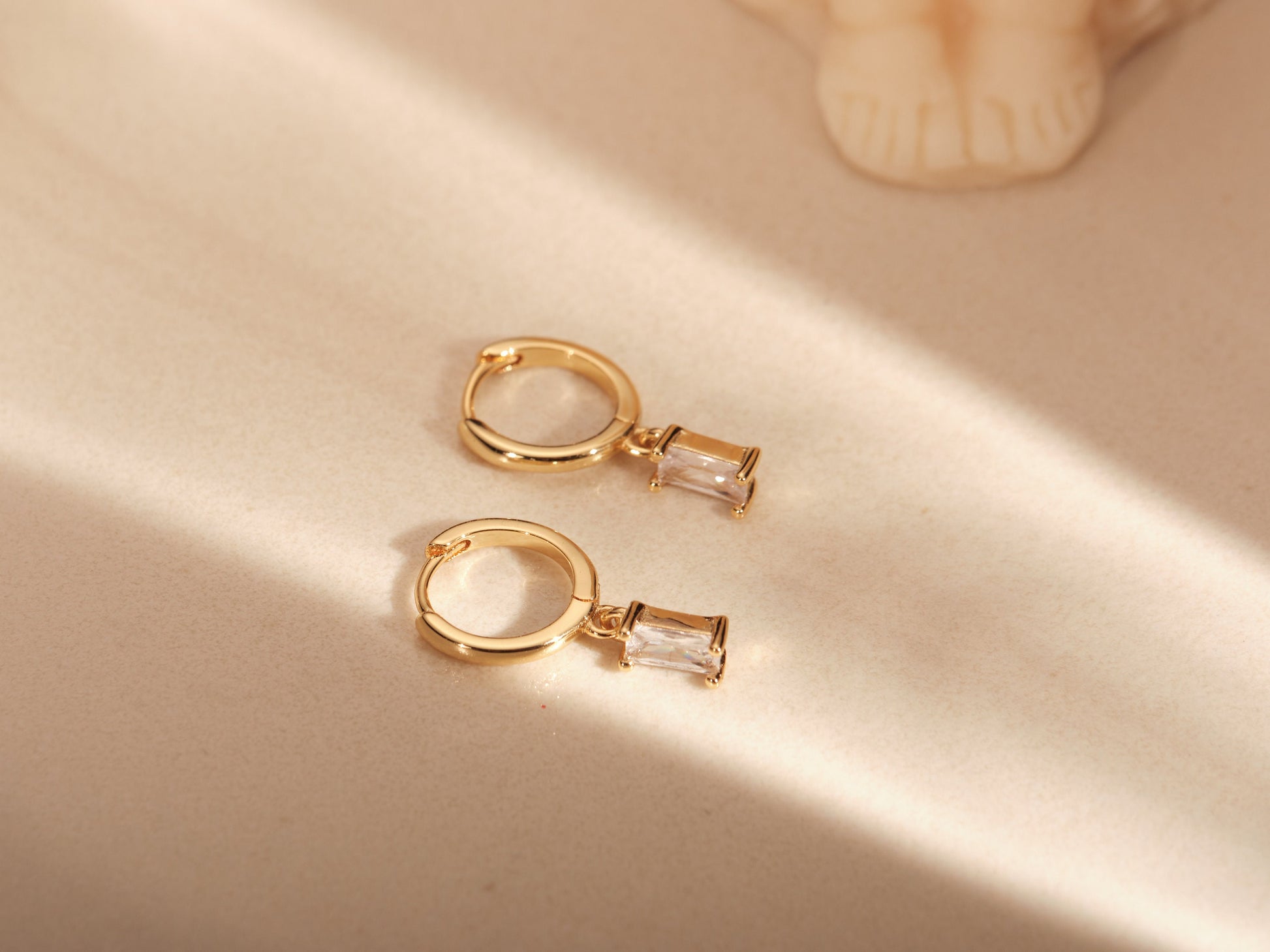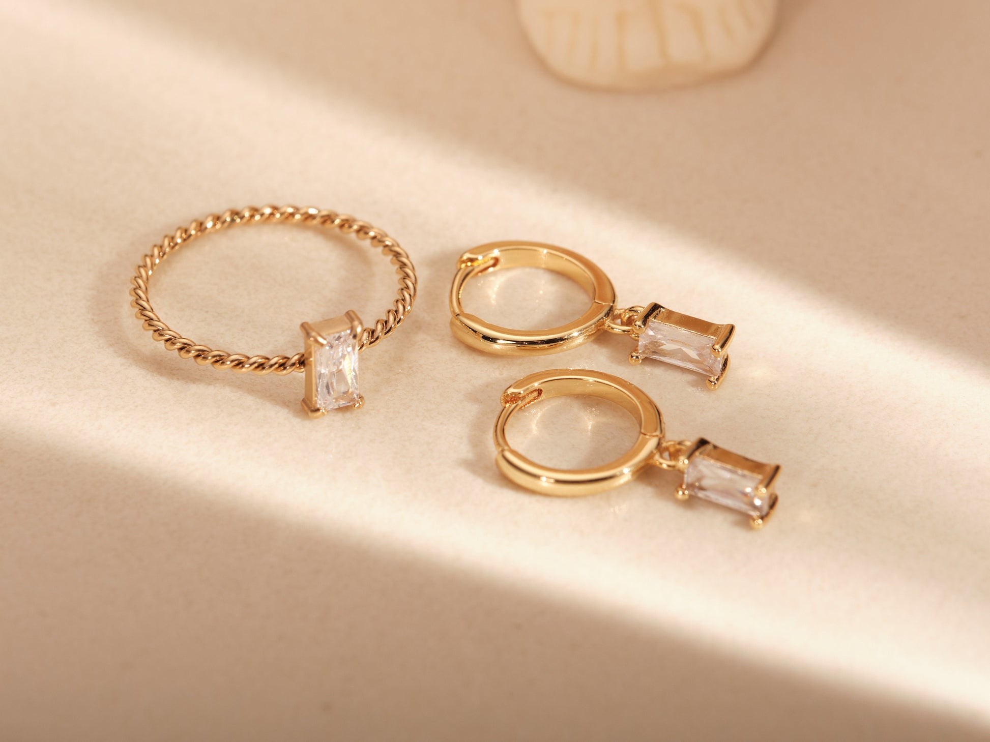 Emerald CZ Ring, Emerald CZ Earrings, Dangle Baguette Hoops, Emerald Baguette Hoops, White CZ Baguette Ring, Silver Post Earrings, Cz Hoops