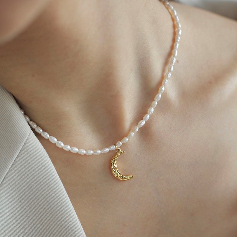 Freshwater pearl strand, Gold Hammered Moon Necklace - Natural Pearl Chain Necklace, Gold moon charm, Freshwater pearl necklace, real pearl
