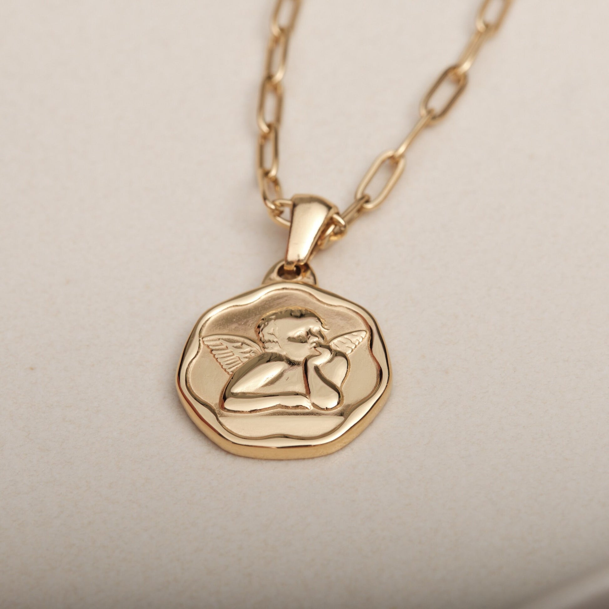 Gold Angel Coin Necklace, Angel Medallion Necklace, Gold Angel Protection Necklace, Guardian Angel Necklace, Birthday Gift, Christmas Gift