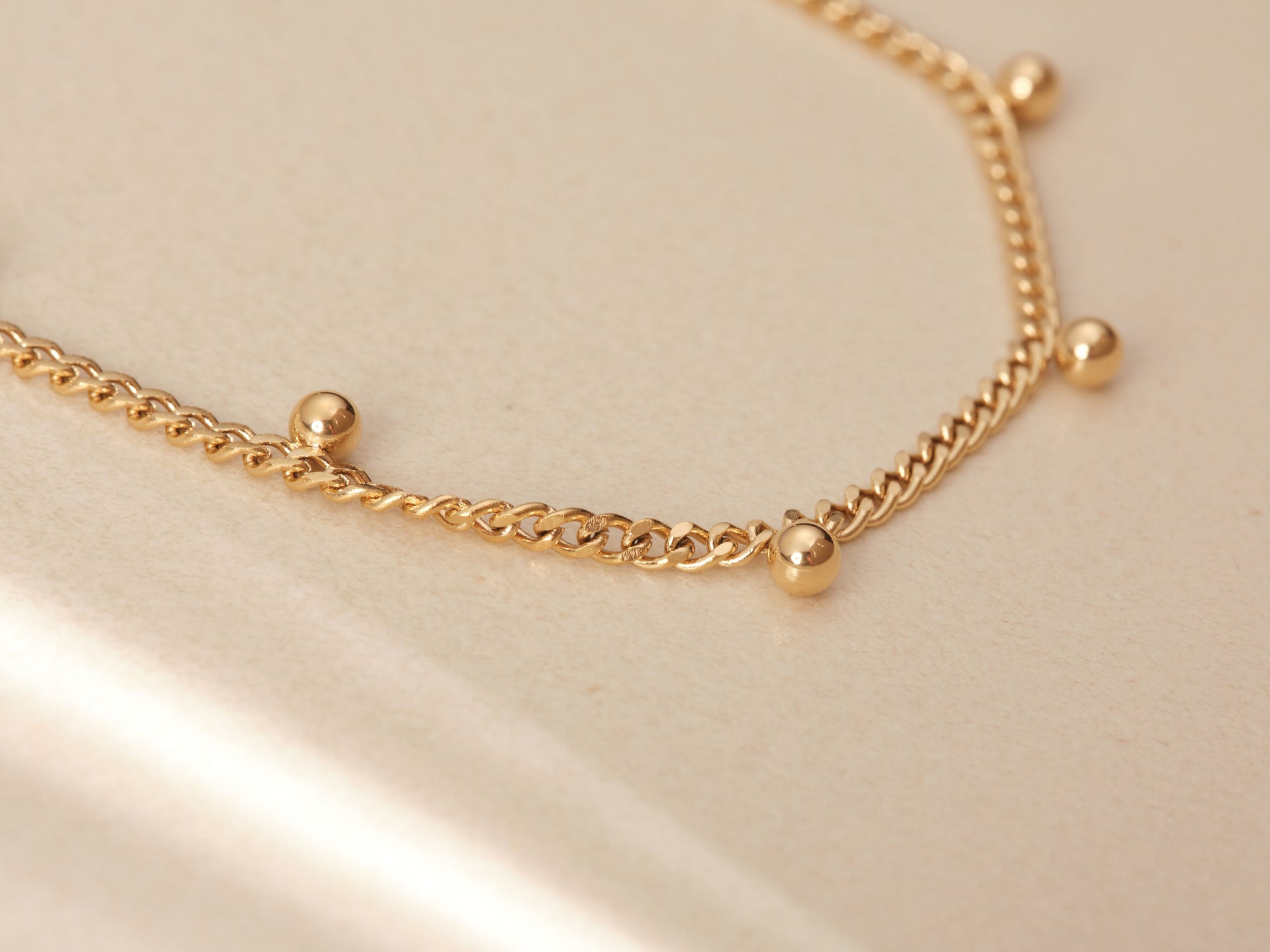 - Gold bead chain: 15" + 2"; Bracelet 6" + 2";