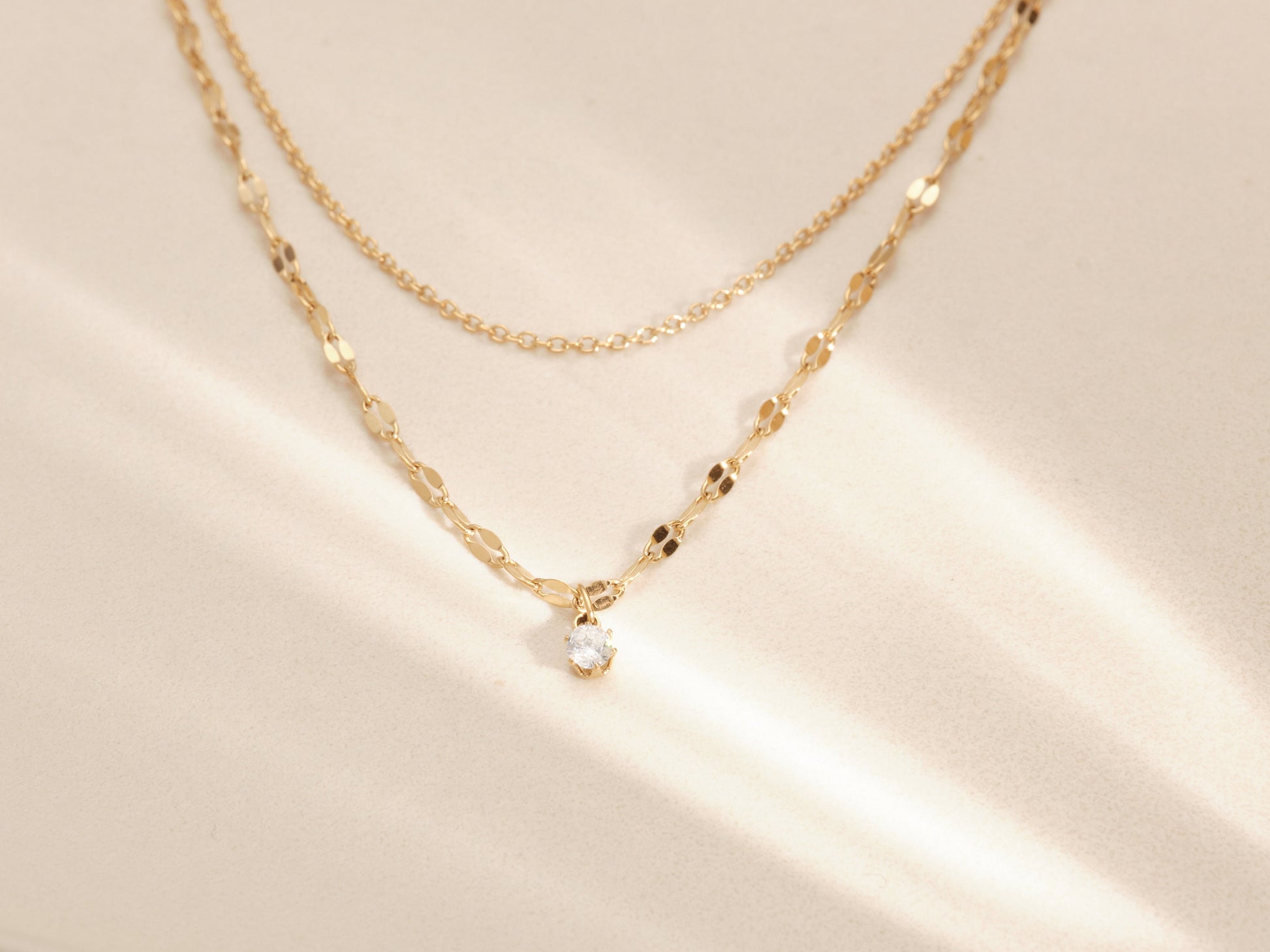 Gold Double chain CZ Necklace, Tiny Zircon Necklace, Tiny cz Necklace, Dainty Necklace, Sequin Chain Necklace, Float CZ Necklace, waterproof