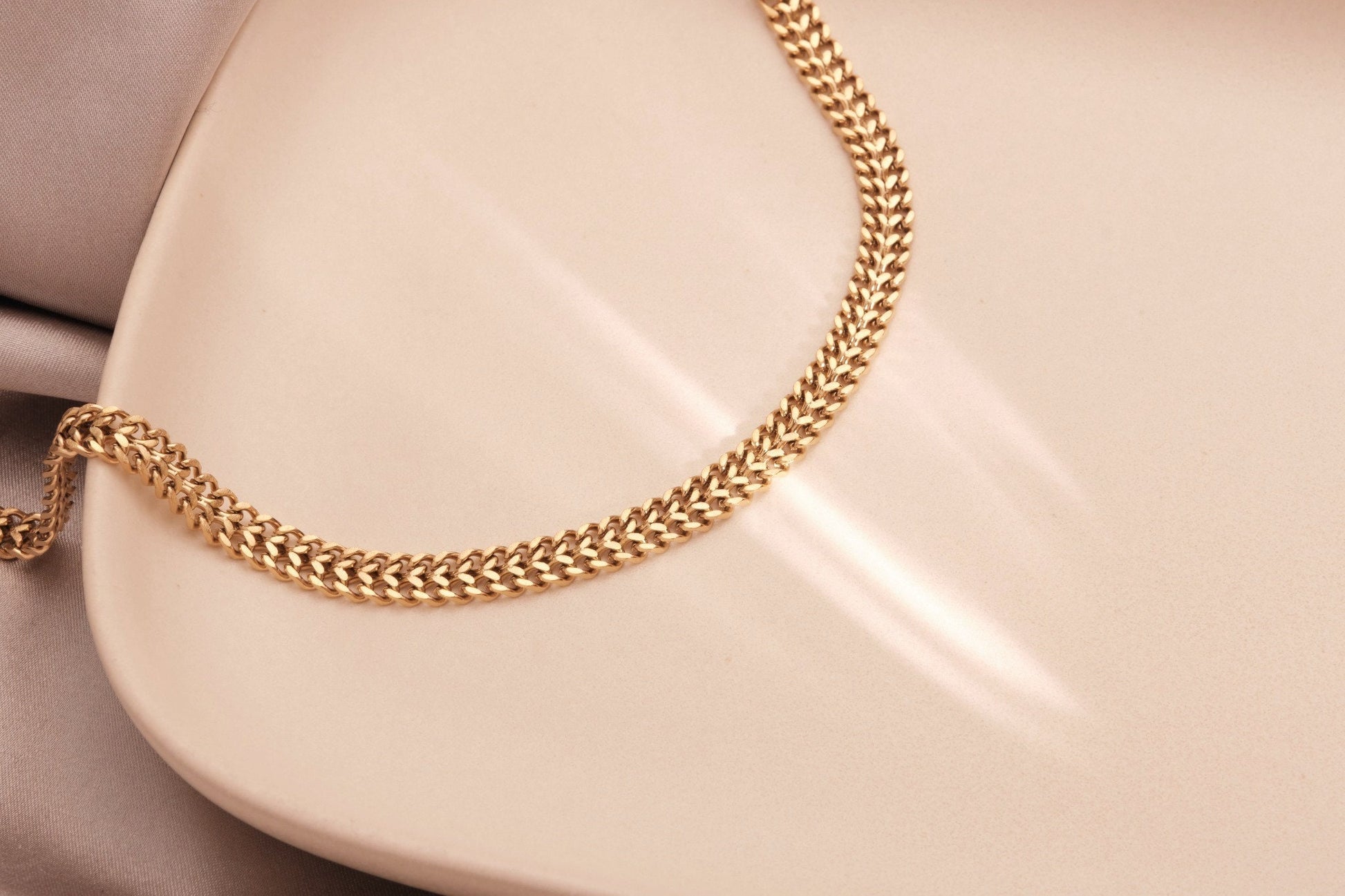Gold Double Layer Necklace, Green Zircon Necklace, Vintage Double Cuban Choker, Cuban Chain Choker Necklace, WATERPROOF Tarnish Free Jewelry