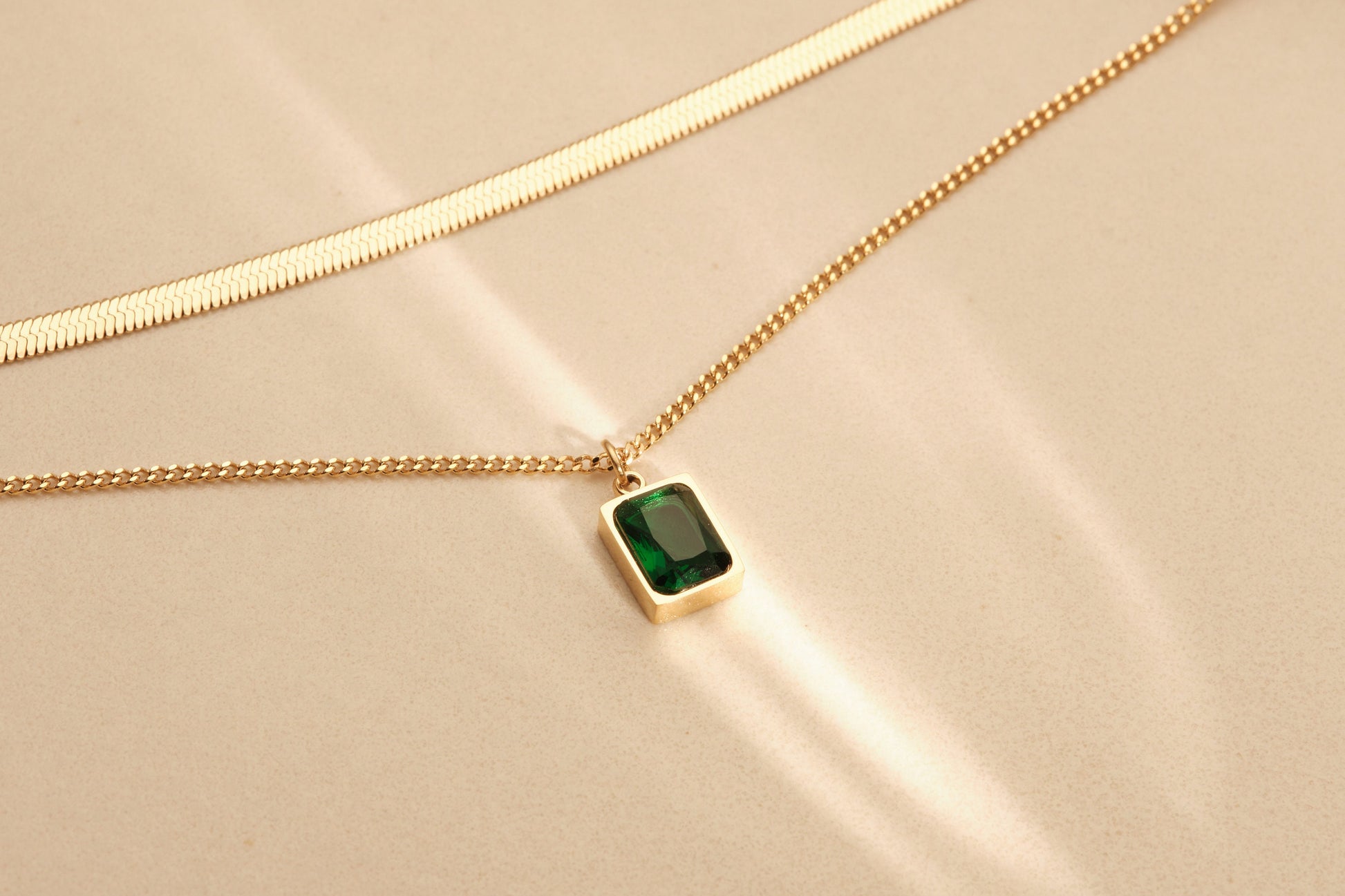 Gold Herringbone Layered Necklace, Square Gemstone Zirconia Necklace, WATERPROOF, Snake Chain Necklace, Double Layer Necklace, CZ Pendant