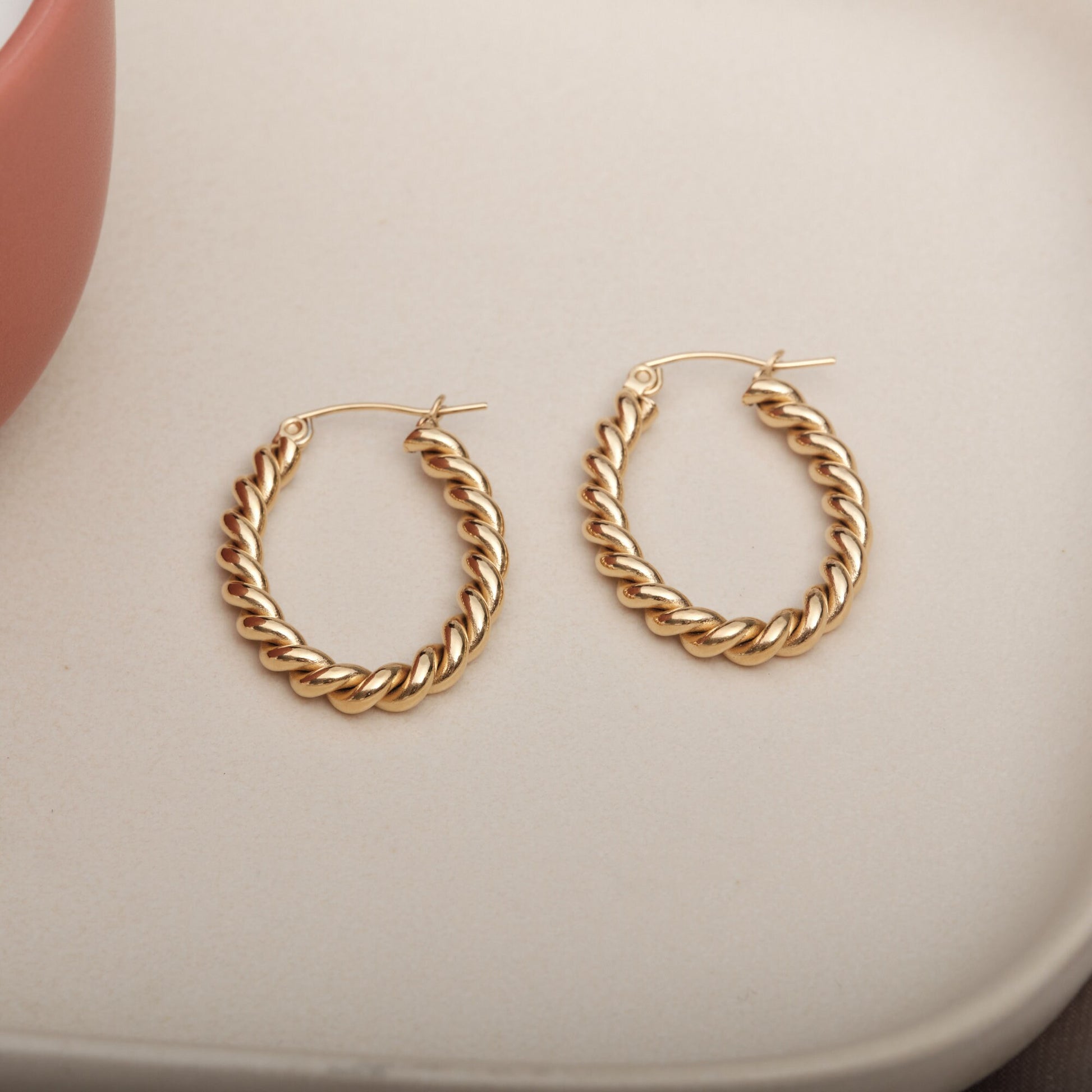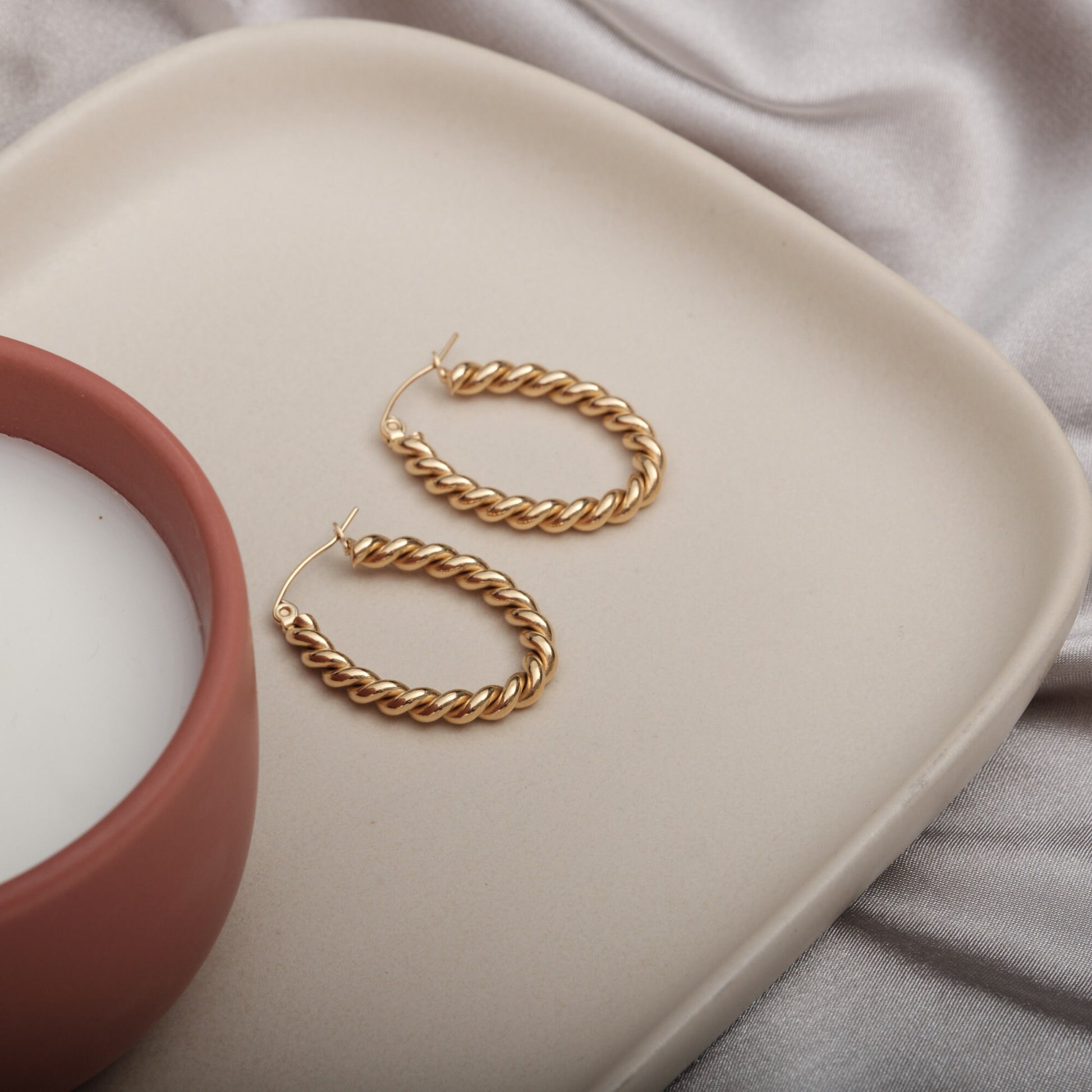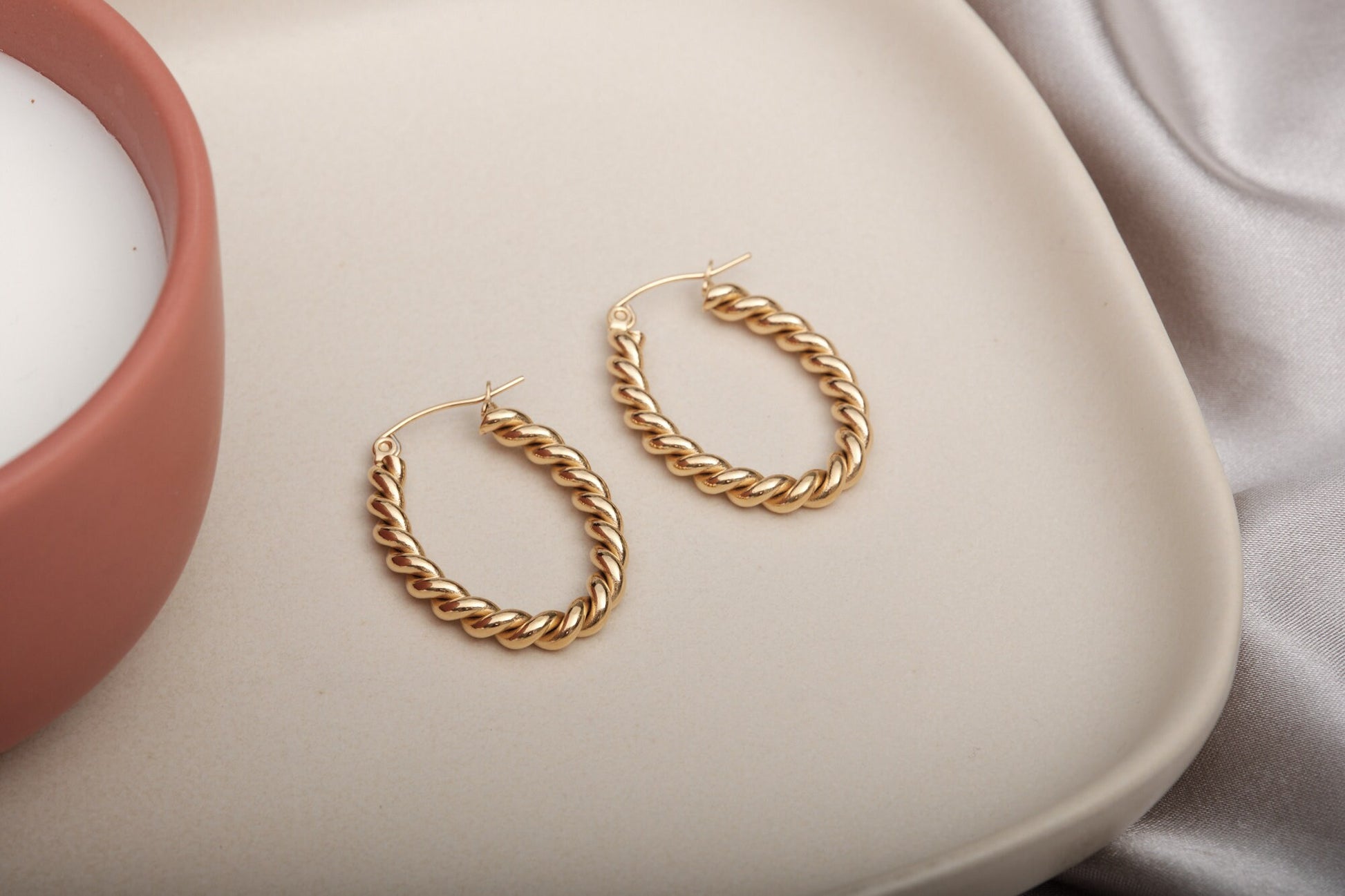 Gold Twist Hoop Earring French Twist Vintage Titanium Oval Earring Hoop Oval Huggie Water and Tarnish Resistant Oval Twisted Hoops