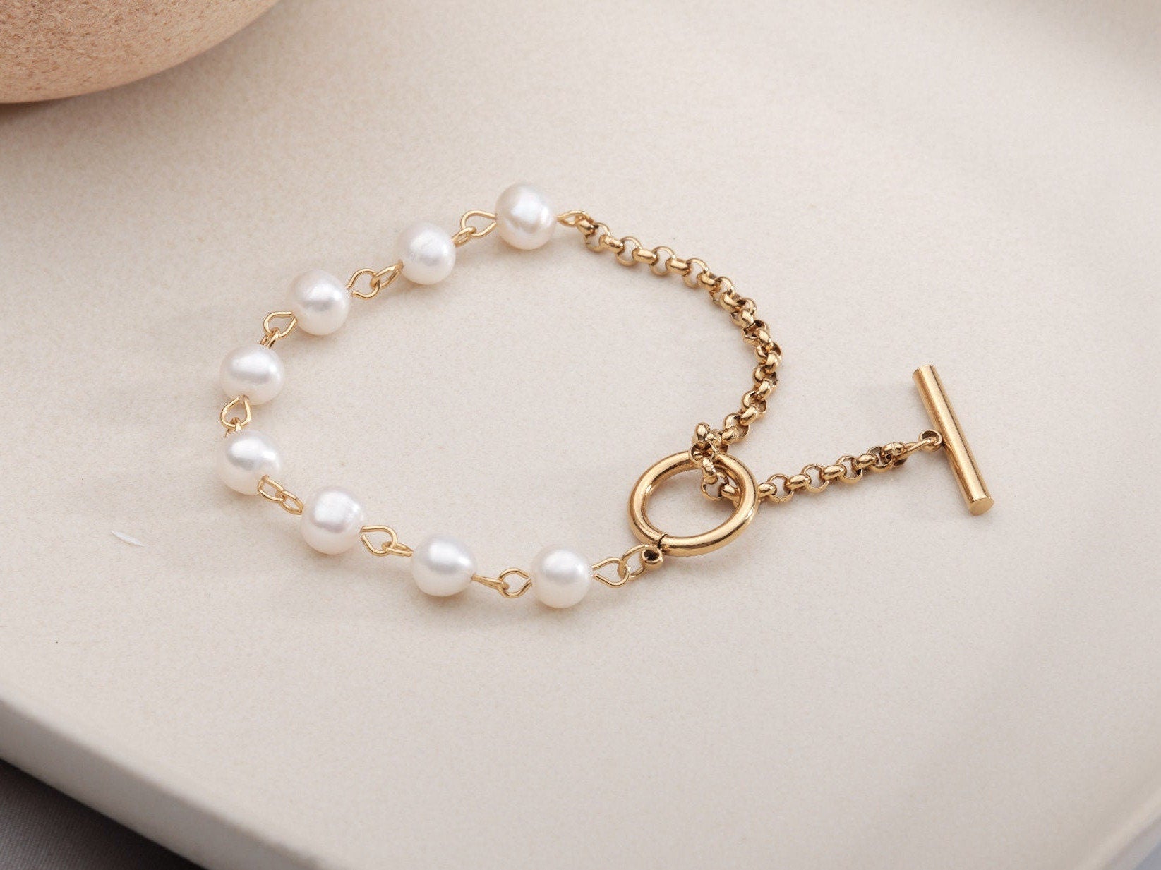 Half Baroque Pearl Half Gold Chain Bracelet,OT Clasp Bracelet,Real Pearl Toggle Clasp Bracelet,Freshwater Keshi Pearl Bracelet Waterproof