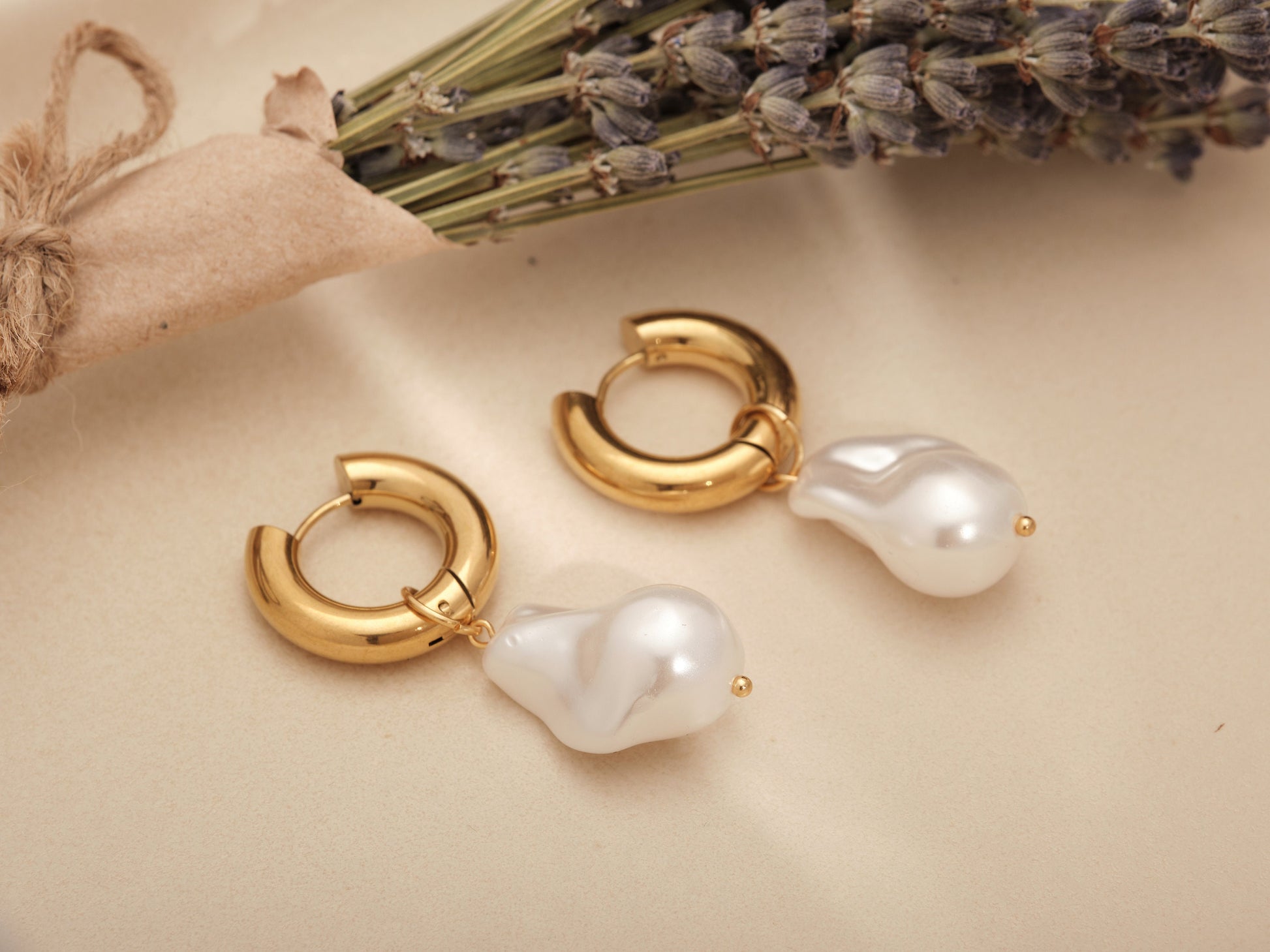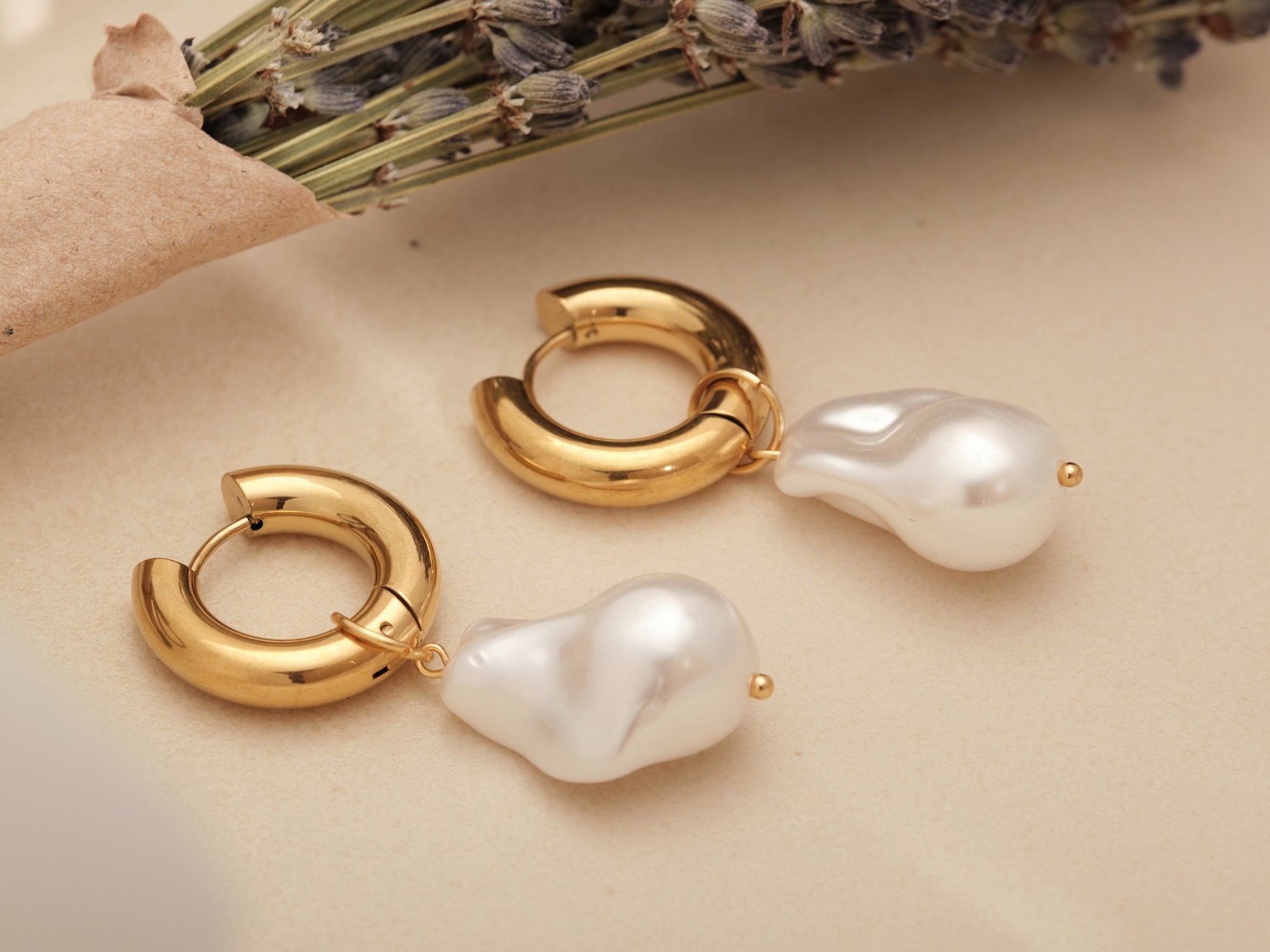 Pearl Hoop Earring Bridal Jewelry Gold Hoop Earrings Baroque Pearl Earrings Gold Hoops Minimalist Jewelry Bridesmaids Gift Set WATERPROOF