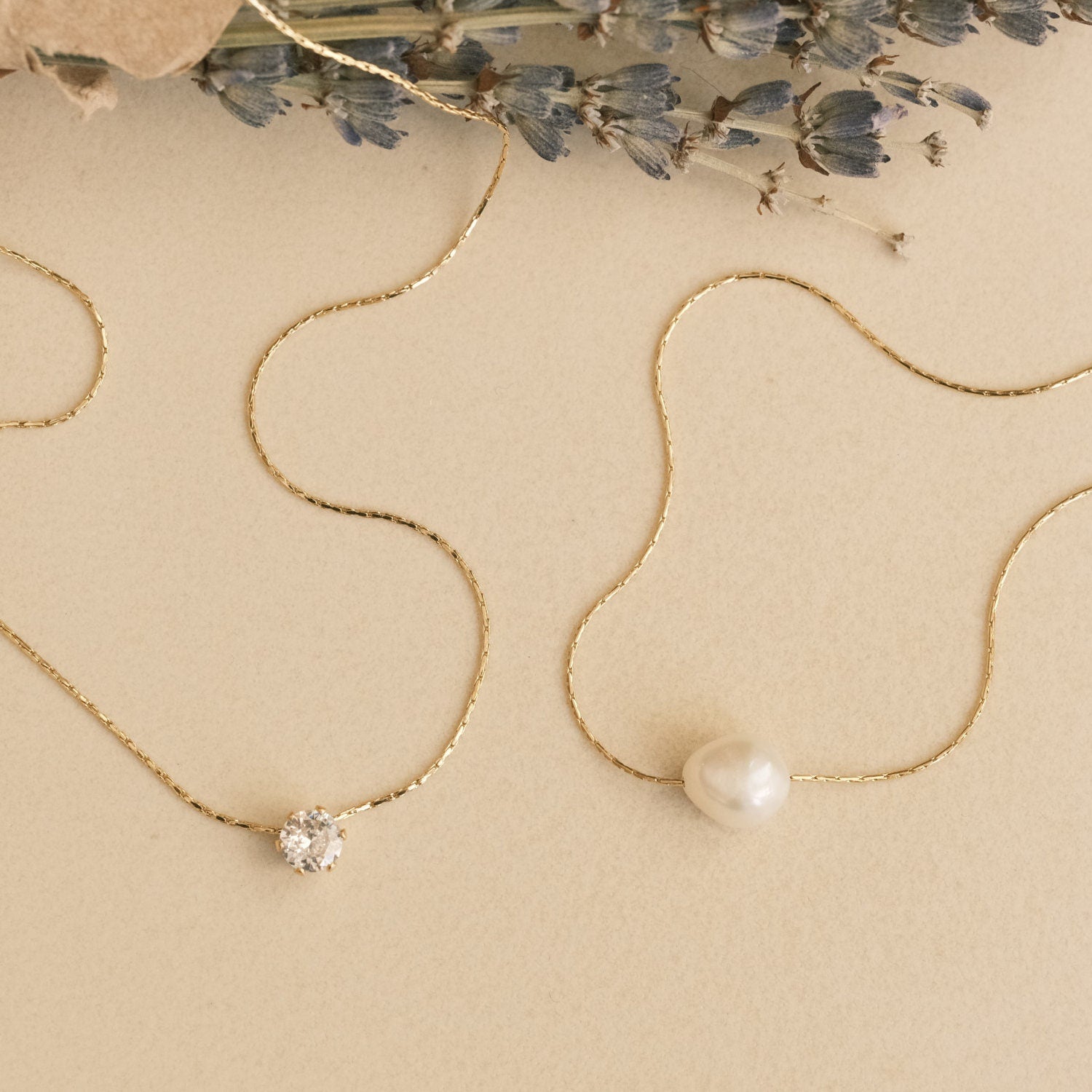 Single Baroque Freshwater Pearl Necklace, Extra Thin Snake Chain, Floating Diamond Crystal Necklace, 18K Gold PVD Necklace, Dainty Necklace