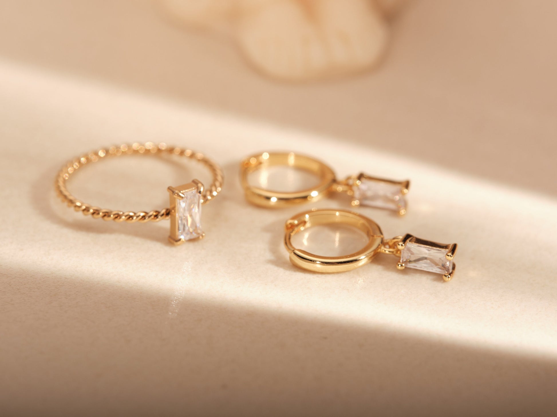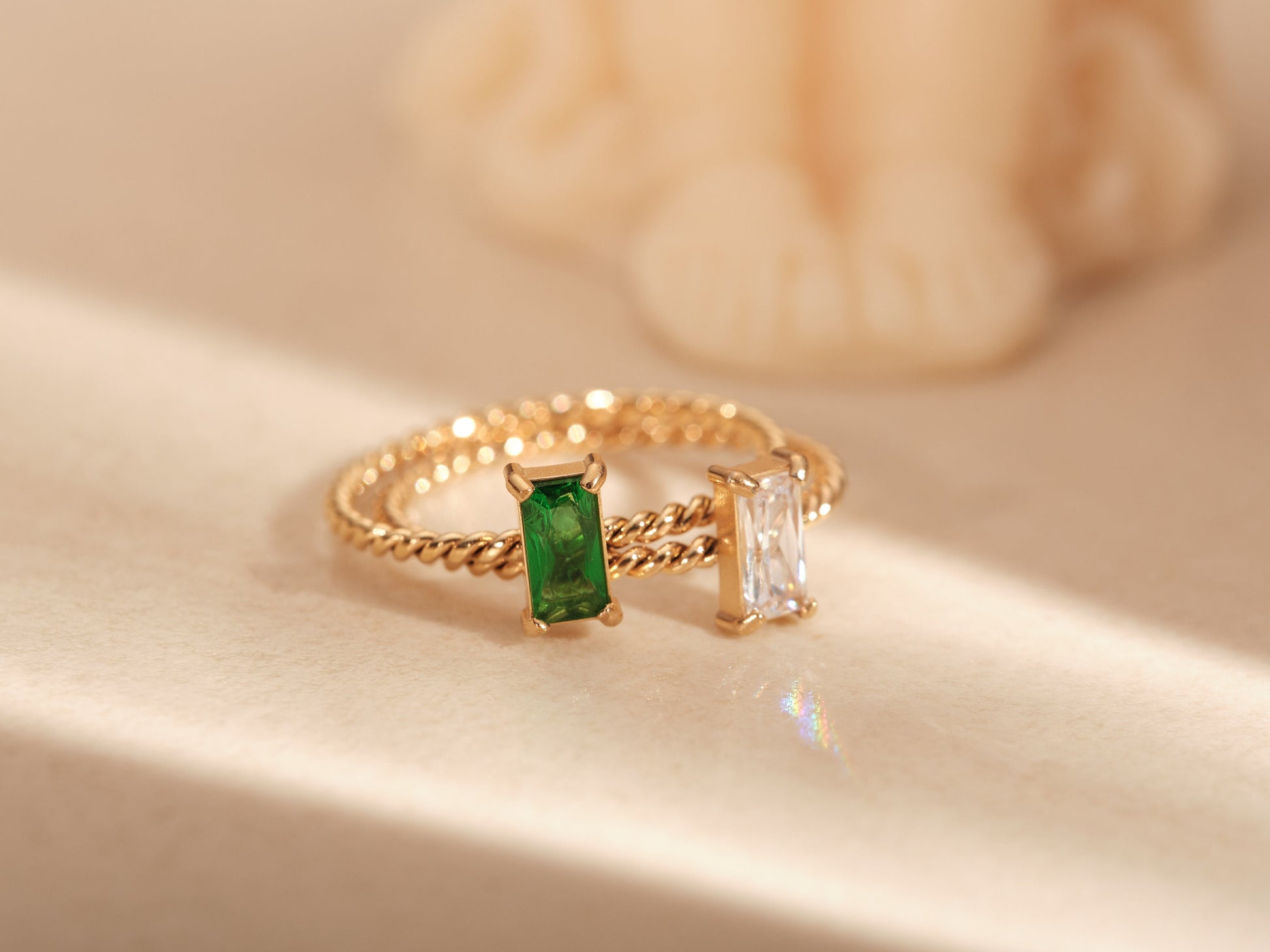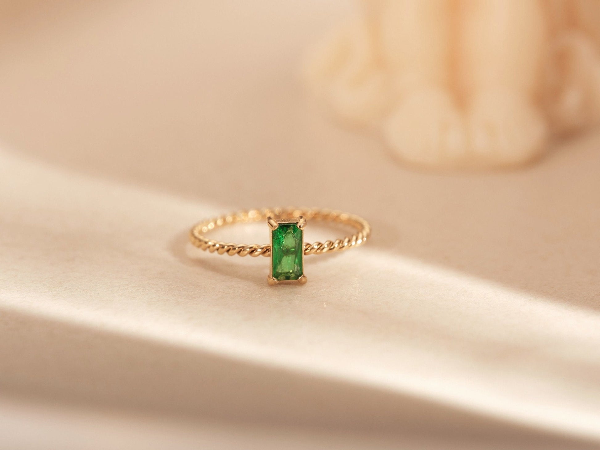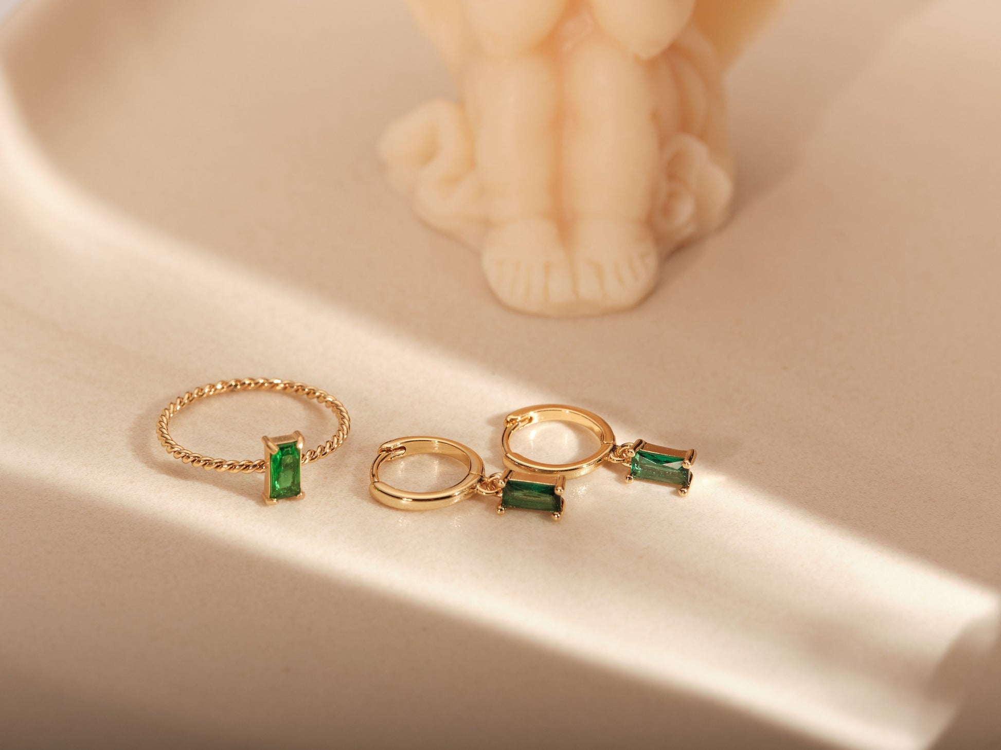 Zircon Stone Ring, Perfect Gift for her, Green CZ Ring, Emerald Earrings, Emerald Baguette Hoops, White Baguette Ring, Silver Post